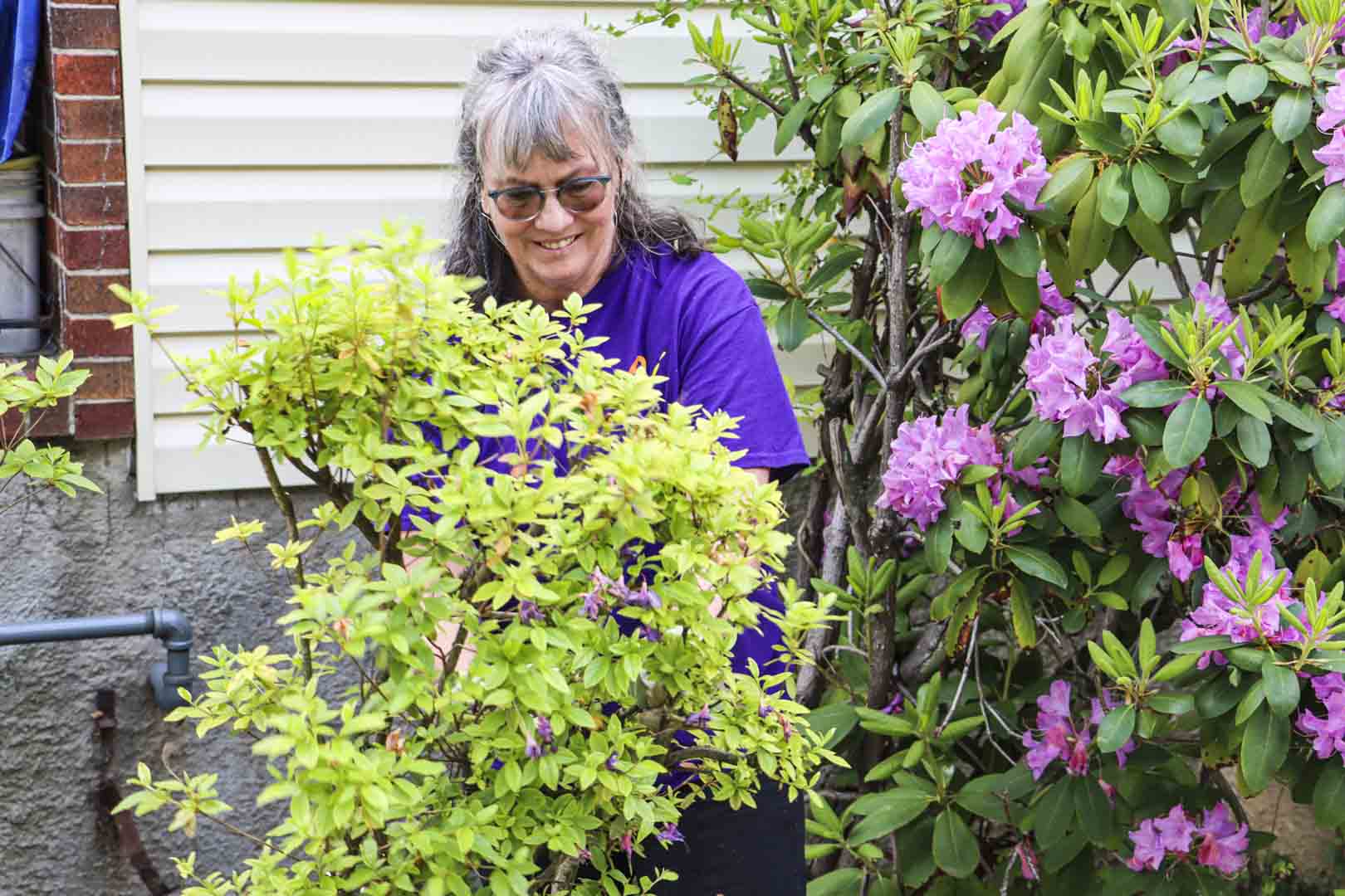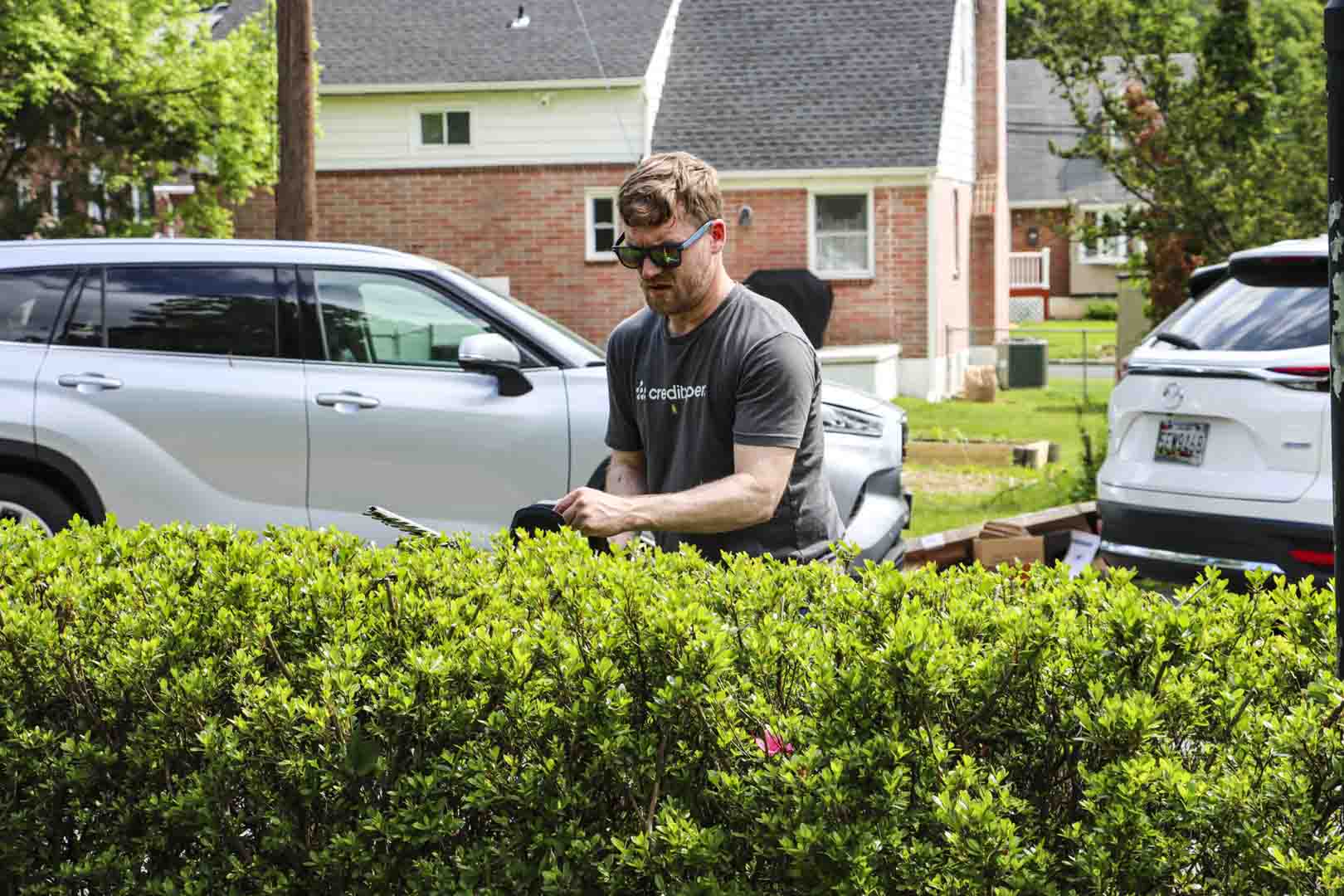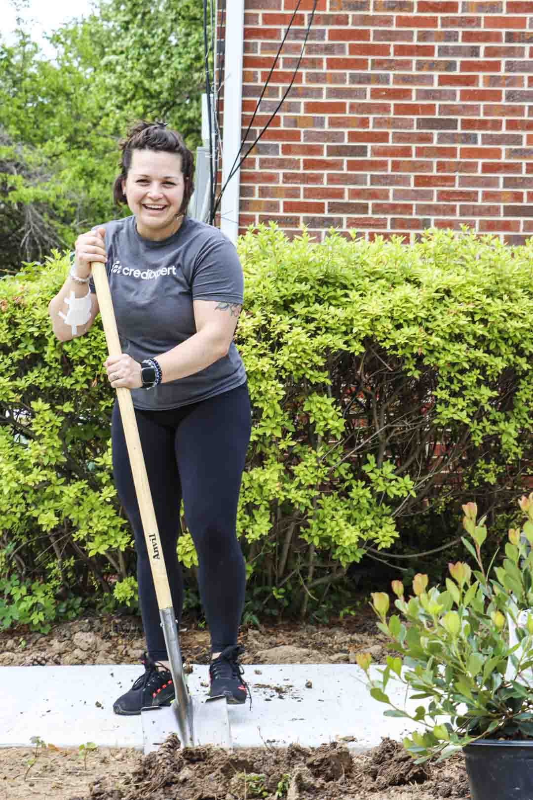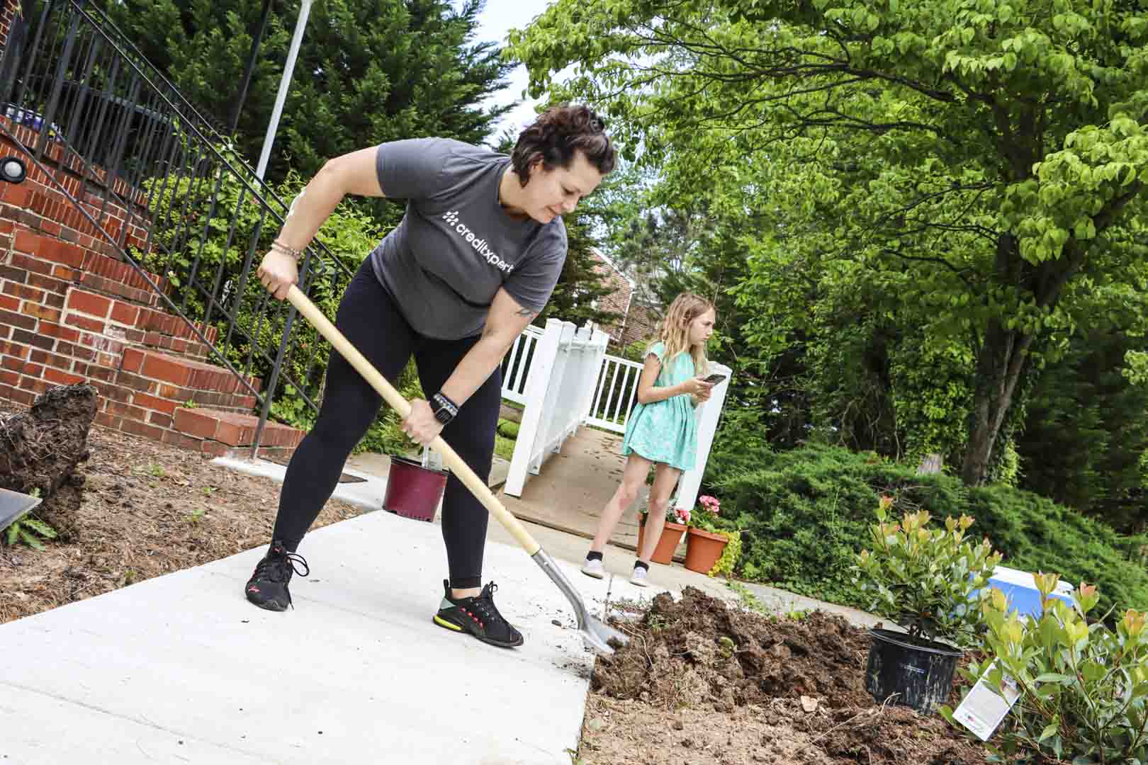 Kayla, her daughter Lilly, and her colleagues Janette, Thomas, Bobby, Ashley, Peter, and Chris joined the development team for a lively afternoon of edge-digging, hedge-trimming, weed-pulling, mulch-spreading, and bush-planting! The curb appeal crew met with a very grateful James who loved his house’s new look. They worked non-stop for three hours and treated everyone to dinner on their newly-donated patio set.